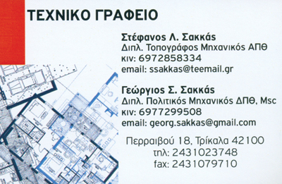 customer tabsΕπικοινωνίαΔιπλωματούχος Πολιτικός ΜηχανικόςΔηλώσεις κτηματολογίου - Τοπογραφικά Διαγράμματα - Εντοπισμός θέσης ακινήτουΑναλαμβάνουμε όλη την διαδικασία δήλωσης της ιδιοκτησίας σαςΠολιτικοί ΜηχανικοίΔόμηση - ΚατοικίαΠερραιβού 18ΤΡΙΚΑΛΑ ΤΡΙΚΑΛΩΝΤΡΙΚΑΛΑΘΕΣΣΑΛΙΑ 2431023748 6977299508 6972853342431023748ssakas@teemail.comgeorg.sakkas@gmail.com Το προτείνω (έχει προταθεί 0 φορές) ΦωτογραφίεςFacebook LikeShare on FacebookTweet Widget
